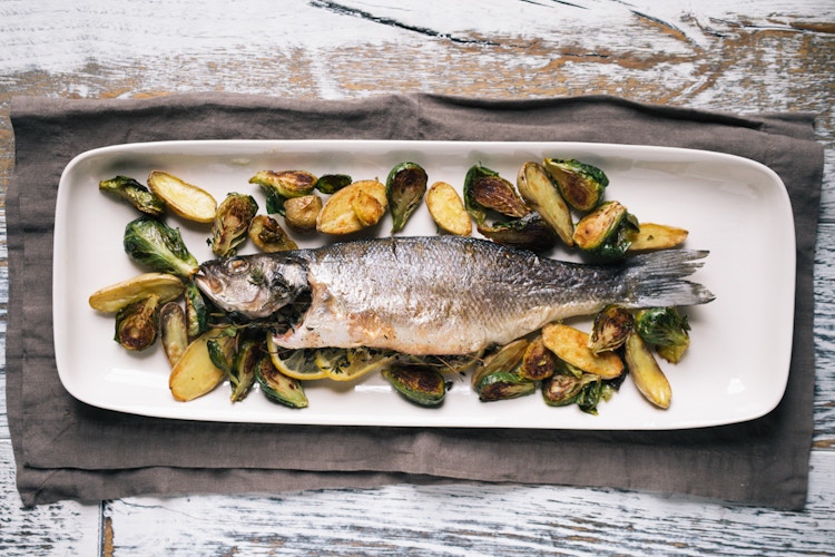 One of my favorite healthy, simple (yet impressive-looking) dinners is Whole Roasted Branzino with Brussels Sprouts and Fingerlings. Roasting a whole fish may seem intimidating, but it could not be any easier. Buy a whole branzino from your local fishmonger (you could substitute it for trout or snapper if you wanted) and ask them to gut it and scale it for you. Then once you get home, all you have to do is salt and pepper it (inside and out), and stuff the interior cavity with rosemary and thyme and lemon slices. Place the fish on an aluminum foil-lined baking sheet and roast for 15-20 minutes or until the meat is opaque and flakes easily.