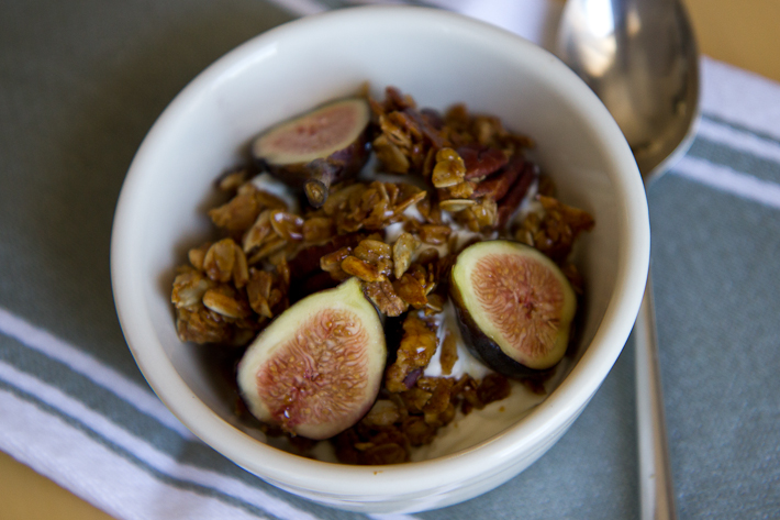 I love this time of year. I love the crisp, cool, blue sky mornings with the smell of fall in the air. I love trading in iced coffee for a steaming mug of cafe au lait. I love pulling out sweaters and boots and scarves and packing up my sundresses for next year. I love watching the leaves change - slowly at first, then suddenly bursting into a riot of reds, golds, and oranges. Most of all, I love the chance to turn on the oven and start baking. The pumpkin craze will hit soon enough – consider yourself warned that I'll be posting mad recipes for pumpkin bread, muffins, scones, cakes, and more in the coming months! – but for now, I'm making batch after batch of maple pecan granola. Given that its prime fig season, there's nothing better for breakfast then a bowl of Greek yogurt with fresh figs, crunchy homemade granola, and a drizzle of really good honey.