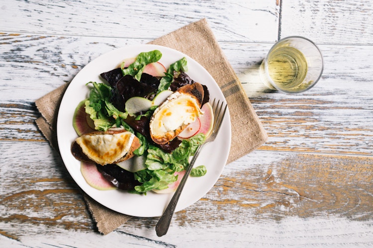 Once I have all of the elements prepared, I composed everything on the plate: watermelon radishes first, then the lettuces, gently tossed with the apples, radishes, and vinaigrette. I made a small mound in the center of the plate (with the radishs fanning out) and placed the two goat cheese croutons on top. I wanted it to have a sort of rustic, French bisto feel, so I added a glass of wine and a rustic napkin.
