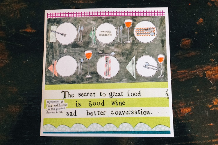 Dinner parties are a time commitment (I know...I'm cooking for 10 people tonight!), but they're truly one of life's greatest pleasures. I hope this card inspires you – as it did me! – to gather a few friends together, share a meal, and practice everyday abundance. After all, "enjoyment of food and friends is the greatest pleasure in life."