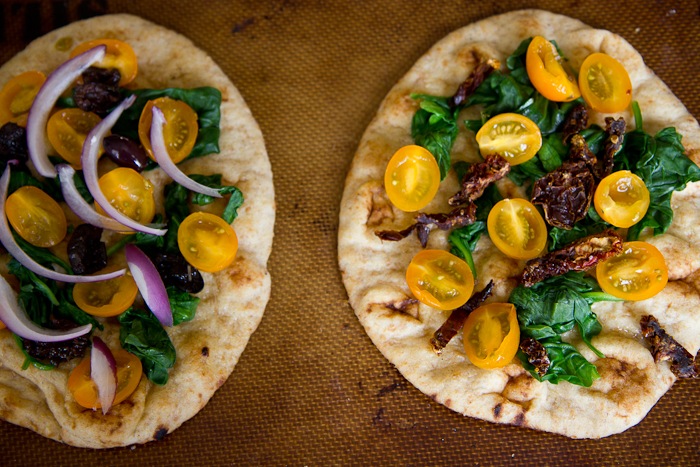 But I have to say, flatbread pizzas are still my favorite. I love topping whole wheat naan with whatever veggies I have in the fridge – it could be tomatoes, spinach, red onions, zucchini, olives, whatever really! – and maybe some chicken sausage and a bit of cheese (mozzarella's the best because it melts so well, though goat cheese and fontina are also delicious). This is also a really fun dish to prepare with kids, as they can each make their own personal pizza.