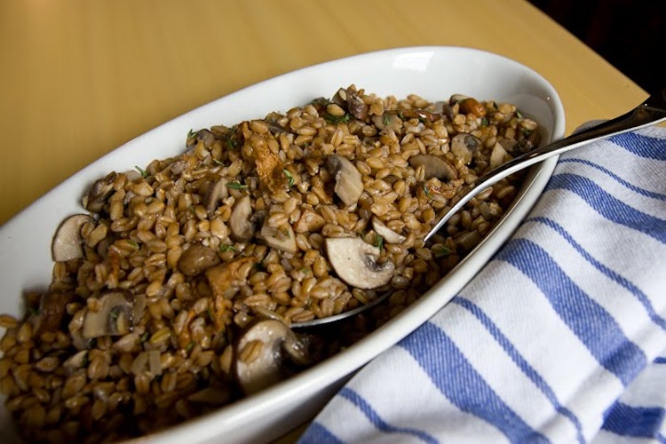 So I set out to create a healthier version of my childhood favorite. I wanted to make a dish that still had the lovely golden color, intense mushroom flavor, and pleasantly grainy texture as my mom's Brown Rice, but with less fat and sodium. I got to work, substituting farro (a high-fiber Italian grain) for the rice and replacing the canned mushrooms with sautéed fresh mushrooms. I eliminated the cans of soup just added a little white wine, garlic, and fresh thyme for flavor. And rather than butter, I just used a bit of heart-healthy olive oil.