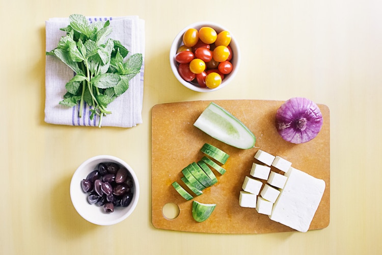 The salad made an impression on me for many reasons. For one, it was the first time I'd ever eaten a salad without lettuce. The Greek version had chunks of cucumbers and tomatoes, sliced red onions (and usually green peppers), and olives, topped with a rectangle of feta. The salad was sprinkled with a generous pinch of dried oregano, a bit of salt and pepper, and drizzled with red wine vinegar and really good extra virgin olive oil. Simple, but so profoundly good.