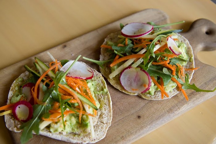 My go-to lunch when I'm working from home are these super-simple (and super-healthy!) flat bread sandwiches with a spicy avocado spread and whatever veggies I have on hand. These are inspired by the amazingly delicious avocado toasts at Cafe Gitane–lightly toasted whole grain bread spread with a bright green mash of ripe avocados, lemon juice, chili flakes, salt, and olive oil. I am obsessed with these toasts, so I decided to make my own version at home.