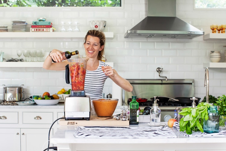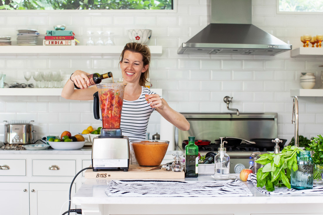 For our Austin dinner party, I made gazpacho from the beautiful heirloom tomatoes we found at the farmers' market there. Lucky for me, Jeanine had a Vitamix, which made for an extra-creamy gazpacho. (You don't have to have a Vitamix, though – I make mine in a pretty standard blender.) During the hottest months of the summer, this chilled soup – packed full of vegetables and bright summery flavors – is one of my favorite things to make. It's so easy, so pretty, and really healthy to boot. And, given you can only make this a few months out of the year, now's the time to enjoy it.