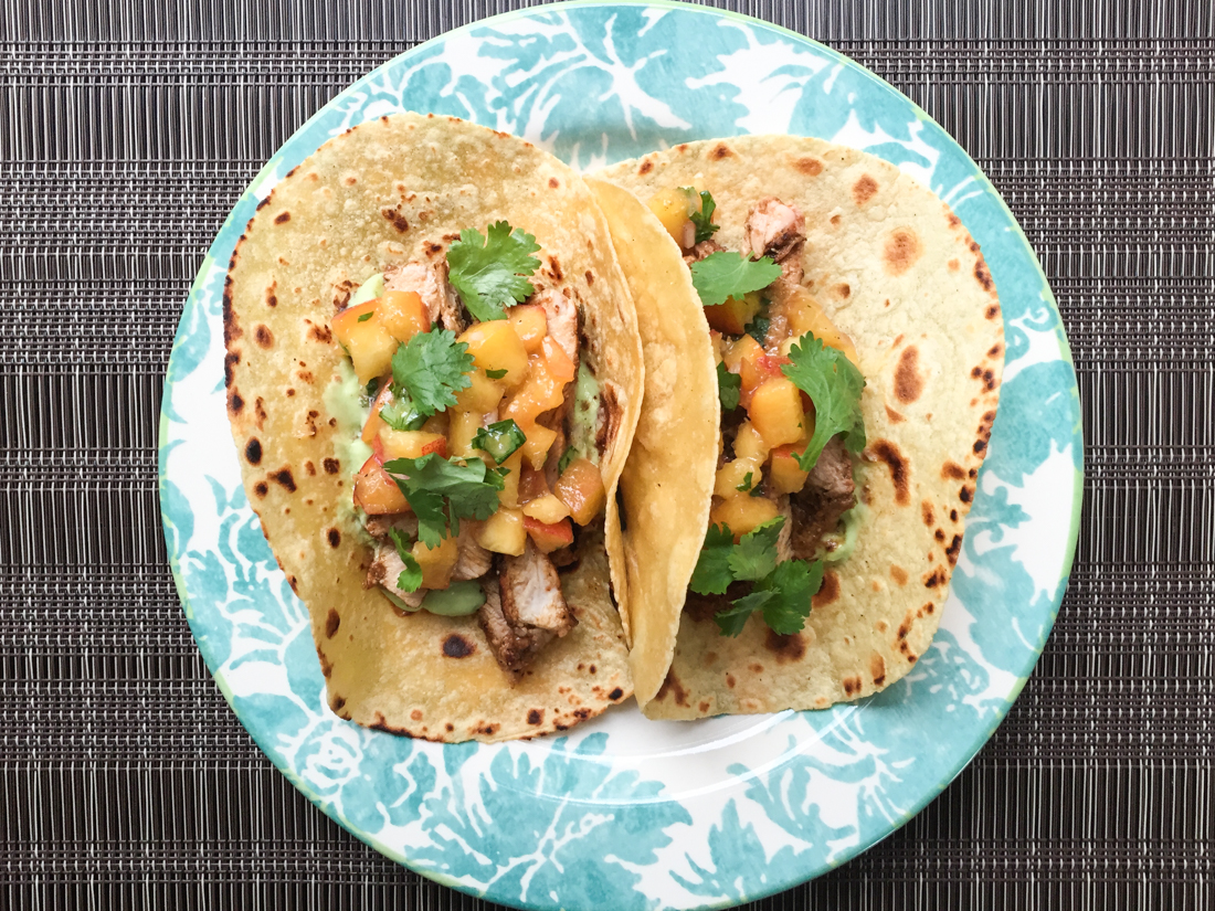 Friday: Spiced Pork Tacos with Avocado Crema and Peach Salsa (recipe below)