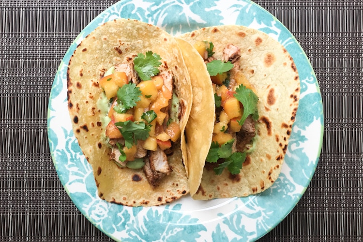 In the meantime, I wanted to share one of my favorite recipes from the current week's meal plan: Spice-Rubbed Pork Tacos with Avocado Crema and Peach Salsa. I can't get enough of peaches right now, and this peach salsa is the perfect compliment to the spice-rubbed pork and creamy avocado sauce. Enjoy!
