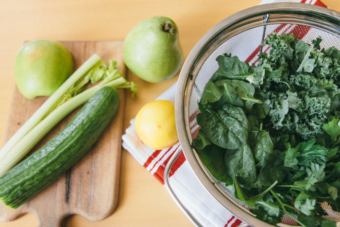 We already eat a pretty healthy diet, but I figured a week-long cleanse wouldn't hurt. Out of everything I was eliminating, coffee was definitely the hardest - I needed something to give me a big energy boost in its place. I wanted to make green juices, but we don't have a juicer. So I thought, why not make a green smoothie in the blender? I'd seen something once about it on Dr. Oz - I checked out his recipe and then sort of created my own version with kale, spinach, cucumber, celery, parsley, lemon, pear, and apple (I don't put ginger in mine, but you could certainly add some).