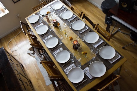 The yellow table was packed to capacity (it fits 12, barely) again this year, and we had a ball. Somehow we only have 11 plates, 11 glasses, etc. so we had to sort of improvise with the twelfth setting. We also only have six matching chairs, so the rest were sort of a hodge-podge of spare folding chairs, drum stools, and anything else that resembles a seat. But despite our lack of sophistication, I'm still glowing a bit. I'm weird like that...every time I throw a dinner party–despite hours of prep and piles of dishes–I'm walking on clouds for days. I just love cooking for friends, and nothing gives me more joy than seeing the faces of good friends eating and laughing around the table.