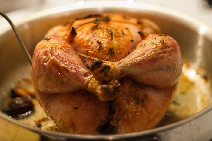 Once your chicken is seasoned and trussed, place the chicken in a roasting pan or ovenproof sauté pan, scatter extra shallots in the pan, and roast for about an hour (depending on the size of your bird) or until golden brown. A thermometer inserted into the deepest portion of the thigh should 165 degrees F.