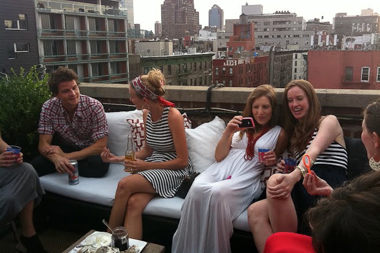 The routine goes a little something like this: we start with drinks and appetizers outside, then I'll sneak down to the kitchen to grill some burgers (of fish or chicken), roast some sweet potatoes, and maybe steam some green beans or toss a salad. By then, the apartment is usually filled with smoke–we don't have a hood over the stove–so I'll open all the windows and turn on the fans and start waving dish towels. Finally, I'll lay all the food out on the table, everyone makes a plate, and we all head back up to the roof. I know this isn't a traditional "sit around the table" dinner party, but on a beautiful night, it seems a shame not to enjoy our outdoor space.