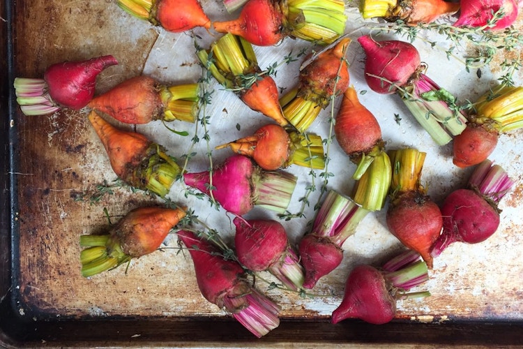 Wednesday night, I cooked for an 18-person dinner party at designer Ernest Alexander's house. My friend Chinae Alexander (no relation to Ernest!) just launched her own events company and she created the most gorgeous spring floral arrangements, and an absolutely stunning table. I made a late-winter, early-spring menu that included a mache salad with roasted baby beets (pictured above!), goat cheese, toasted hazelnuts, and a white Balsamic vinaigrette. For the main course, I made a pork loin with fig-rosemary butter and prosciutto, roasted garlic potato puree, and haricots verts with Dijon-shallot vinaigrette. Then, for dessert, I made my favorite strawberry-rhubarb crumbles (with vanilla gelato). The evening was pure magic, and it was so fun collaborating with friends.