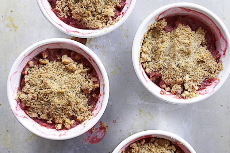 I grew up loving strawberries – I have a picture of myself at age 4 gorging myself on them at a wedding, and nearly ever May of my life I've been to a strawberry festival (with floats and rides and strawberry shortcake!) in my grandparents' tiny little Kentucky town. But I'd never tasted rhubarb until recent years. Frankly, I was a little turned off by its blood-red celery-ish appearance, and I had no idea what to do with it! Once I tasted it, however, I was hooked. More tart than sweet, rhubarb adds complexity and tang to any dessert. It's actually not a fruit – it's a Vitamin C-laden vegetable that's part of the sorrel family. (Who knew?!) The bright red stalks (tinged with a bit of green) arrive in the market in May and last just a few months–until early July. They are best eaten tossed with a bit of sugar and baked into a pie or tart, or simmered into a compote to serve with an almond cake. But perhaps the easiest – and most delicious – way to eat rhubarb is in these summery little crumbles.