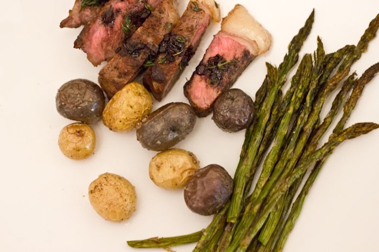 STEAK MARCHAND DU VIN WITH ROASTED ASPARAGUS AND POTATOES